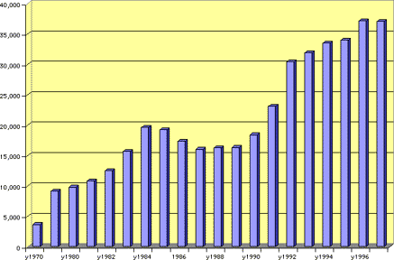 Being so closely linked to the economies of western Europe and the United States, Switzerland has not been able to escape recent slowdowns experienced in these countries. During most of the 1990s, the Swiss economy was western Europe's weakest, with annual GDP growth averaging 0% between 1991 and 1997. Beginning in late 1997, the economy steadily gained momentum until peaking inÊ2000 with 3% growth in real terms. But in 2001 the rate of growth dropped to 0.9%, and in 2002 and 2003 the economy virtually stagnated with real GDP up by only 0.1%. The Swiss Economic Ministry had said that both the lack of an upturn in the global economy -- particularly in the Euro zone -- and the still rather firm Swiss franc would continue to hold back the Swiss economy in 2003. Germany, which absorbs 20% of Swiss exports, was expected to grow by no more than 0.1%-0.2% in 2003.